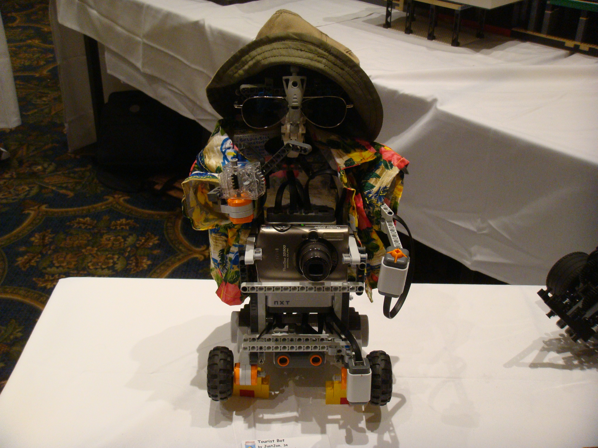 With the construction completed, all that was left was to display TouristBot and watch the reactions. TouristBot was the first of my creations to be unpacked and set up, so it could take pictures of people setting up their creations. A time lapse of building and setting up was created, and a sign was put up telling passers by that they could press the button and take the picture themselves. At the recommendation of fellow NXT builders, a little sign saying “Press” with an arrow was taped to the button to let people know which button to push. (not that there weren’t individuals who didn’t try to just push the button on the camera itself).