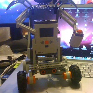 The rest of the build went rather quickly, even if the right arm gearing to trigger the camera went through several revisions until a simplistic answer was found and implemented. The programming went through a few revisions as well, as I hadn’t programmed in the NXT language very much and needed to learn it quickly. Within several hours, the programming was written to take pictures every two and a half minutes – a time limitation based on the Canon digital camera turning itself after three minutes of idle time – or when a user presses the button on the hand.