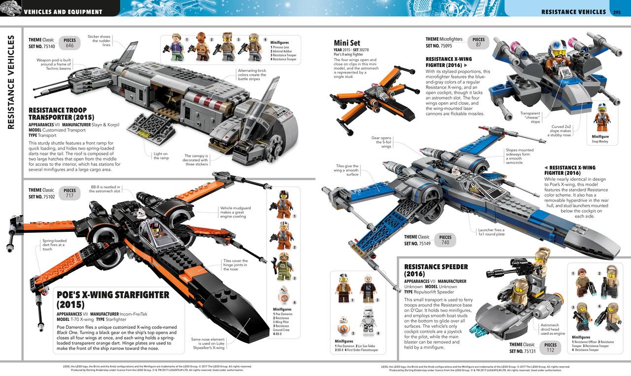 The last and largest section of Ultimate LEGO Star Wars is the vehicles and equipment. The vehicle section is broken down by locations and by groups (Rebels, Imperials, etc.) to allow reference by different alliances. Like the locations, the vehicles are given backstories and more information about the special features and playability of each vehicle. To me, the most interesting are the ships that have been done multiple times and have been detailed out, including all the differences between the different versions. For instance, the X-Wing has been done over a dozen times and the Millennium Falcon has been made about 16 times, and each time is fairly different, but the book gives perspective on each variation and how the models have changed over the years.