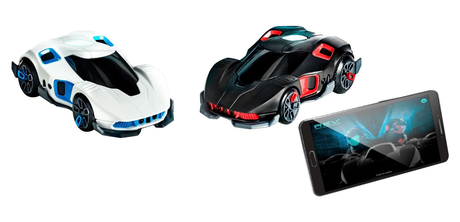 The R.E.V. set comes with two toys cars, a black one and a white one. The cars are remote controlled via bluetooth and can battle each other with virtual weapons “mounted” to the front. Syncing the car to the phone is as simple as tapping the phone to the top of the car once it is turned on then being able to drive it. Two people can challenge each other trying to shoot up the other car until one of the cars runs out of hit points.
