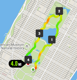 We started on the east side of the park and headed north as our corrals were released with the sound of the horn. We quickly passed the 72nd street transverse and headed up cat hill. The famous statue was upon our left side before we had gotten very far and passed the 85th street transverse for the first mile marker. Without stopping we continued up the east side until we got to the 102nd street transverse and turned left. The second mile marker was in the middle of the transverse as we headed west until we turned left and headed south. Straight down the west side to 72nd street and turning left onto the transverse to complete our four mile course around Central Park for my first New York race of the year.