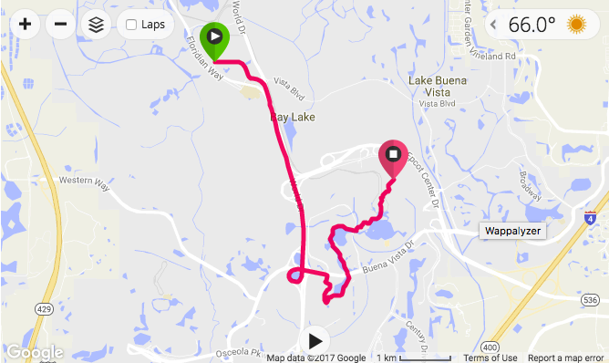 The first of the two races started at 5:30am, and I was able to start in corral A for the 10k. The humidity was high as we started out from the start area and headed south on Floridian Way to World Drive. We took World Drive south for three miles before looking around onto Buena Vista Drive and into the back of Hollywood Studios. We ran a half mile inside the Hollywood Studio park before heading towards Epcot at the four mile mark. We ran north for about a mile on the connection road before entering the World Showcase at Epcot and running through the park to the finish line just beyond the main entrance to Epcot.